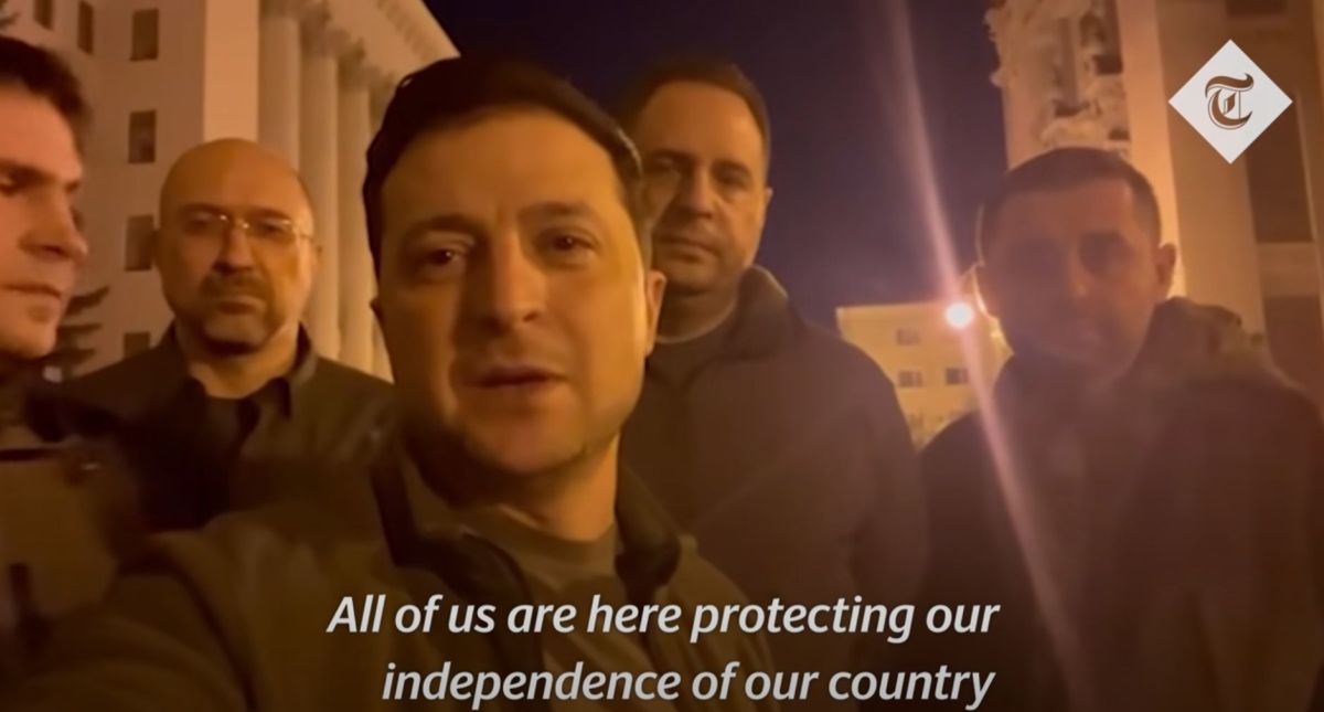Ukrajinski predsednik Volodimir Zelenski je danes zvečer objavil video posnetek, v katerem je skupaj s svojimi glavnimi sodelavci pred poslopjem predsedstva v središču Kijeva sporočil, da bodo kljub napredovanju ruskih sil ostali v ukrajinski prestolnici in branili Ukrajino. Z ameriškim predsednikom Joejem Bidnom pa je govoril o vojaški pomoči. Pravi tudi, da pričakuje, da bo ruska vojska v prihodnjih urah napadla Kijev.