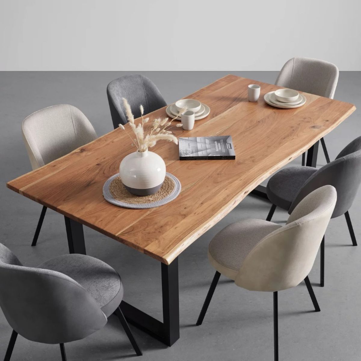 Barva mize je lahko ključni element, ki določa ton vaše jedilnice. Bela miza je čista in sodobna, siva miza je elegantna in sofisticirana, naravna barva lesa pa prinaša toplino in naravni občutek. Izberite barvo, ki se ujema z vašo notranjo opremo in osebnim slogom.